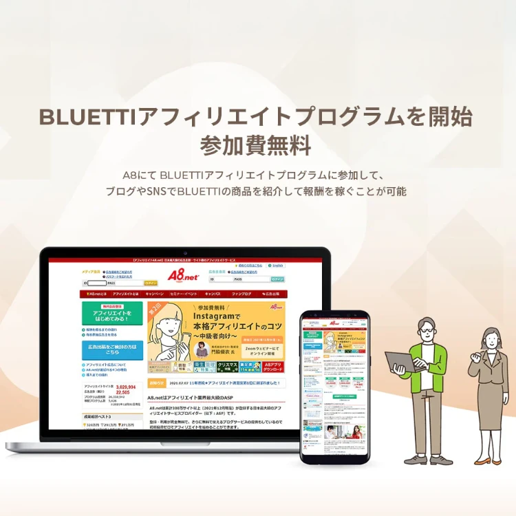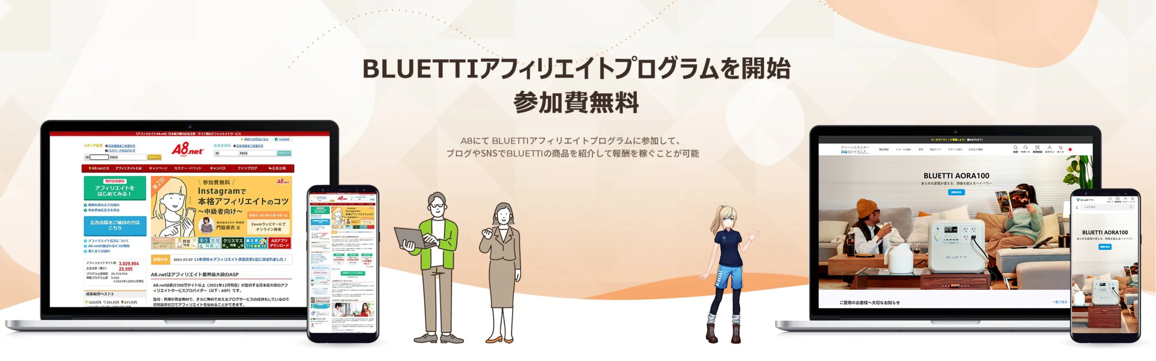 BLUETTIのアフィリエイターになって頂き(A8.net で弊社プログラムと提携し)、ご利用のWebサイト(ブログやホームページ、SNS)にBLUETTI商品紹介のバナーやテキストを貼って頂きます。そして、ご利用のサイトに貼られた広告を経由してサイトの読者やユーザーがBLUETTIの商品を購入すると、成果報酬が得られる仕組みです。