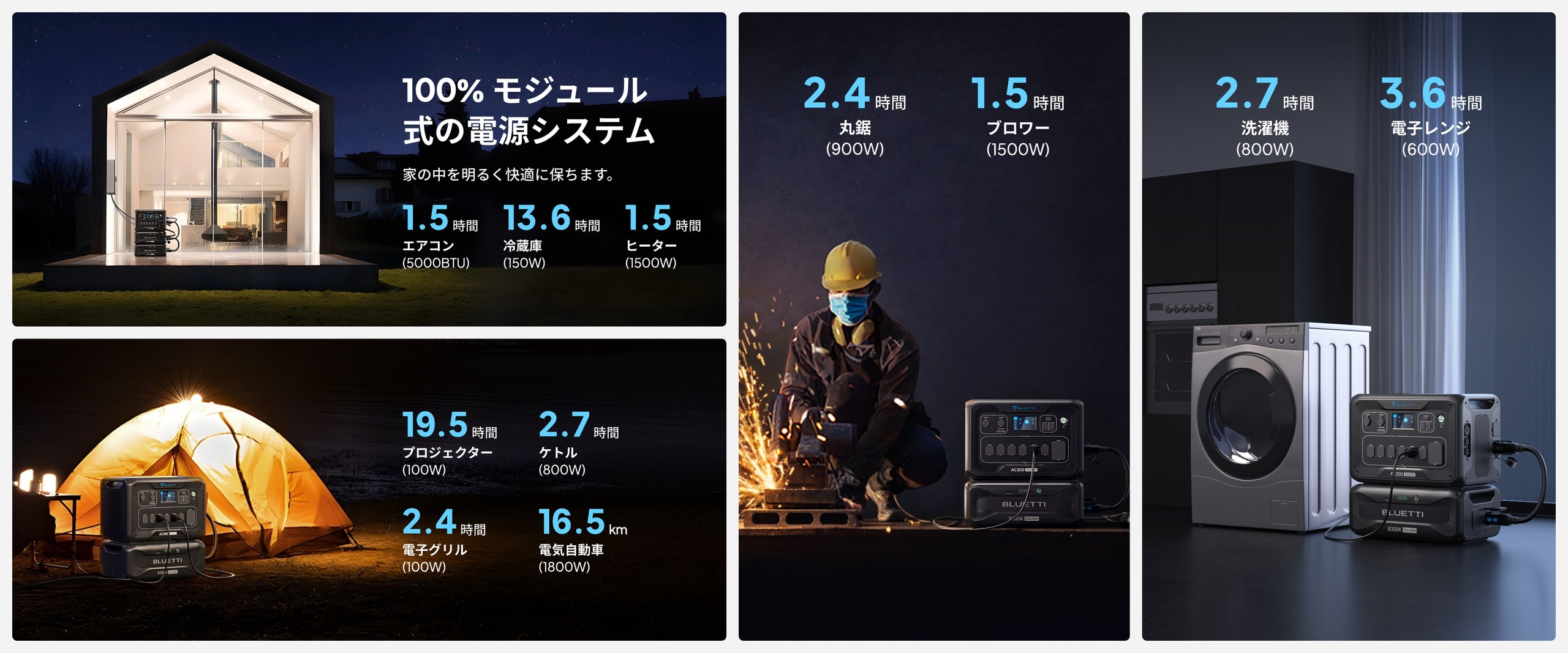 A1:動作時間(推定)= 2764Wh * 0.85 /ご使用の機器の動作電力。(0.85 = 換算係数) 実際の作業時間は異なる環境下で異なる可能性があることに注意してください。