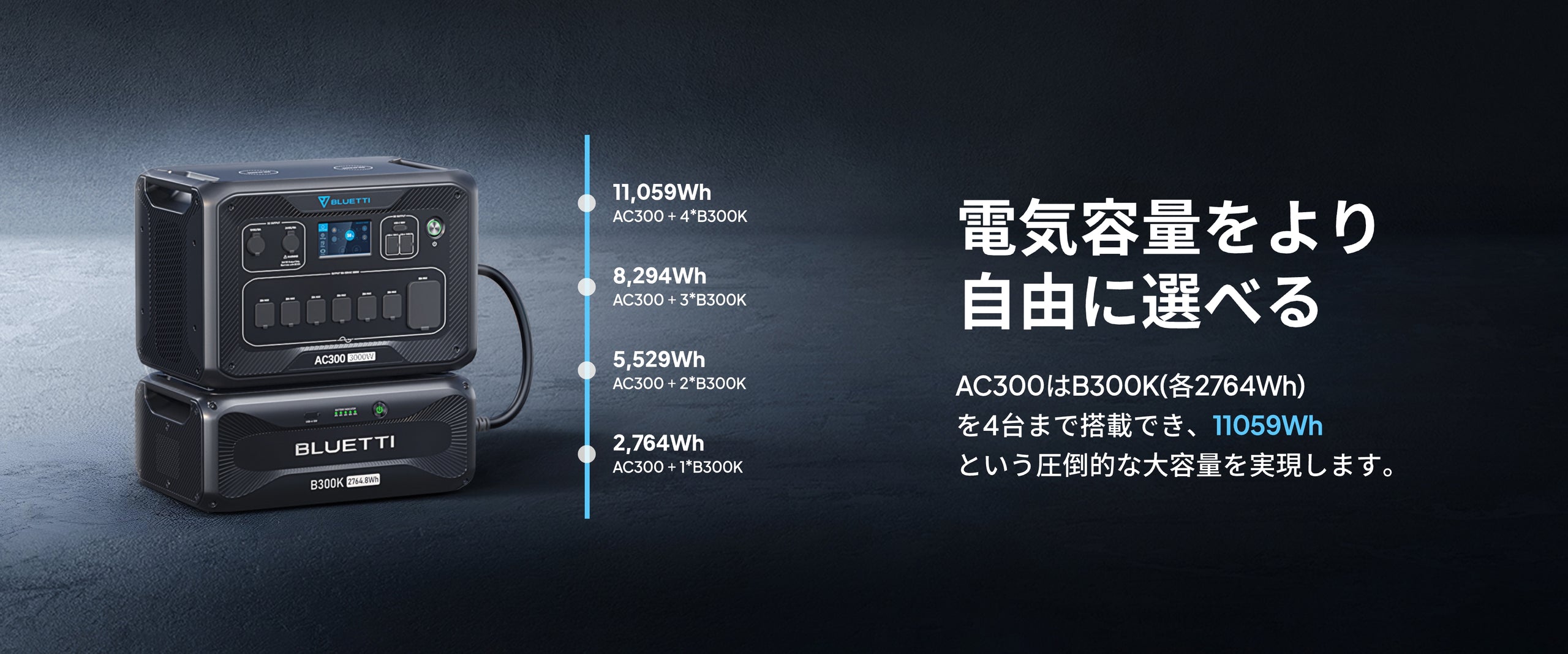 A4:AC300 1台はB300Kを4台(1台2,764Wh)まで接続でき、合計11,059Whになります。B300KとB300組み合わせてAC300に接続出来ます。