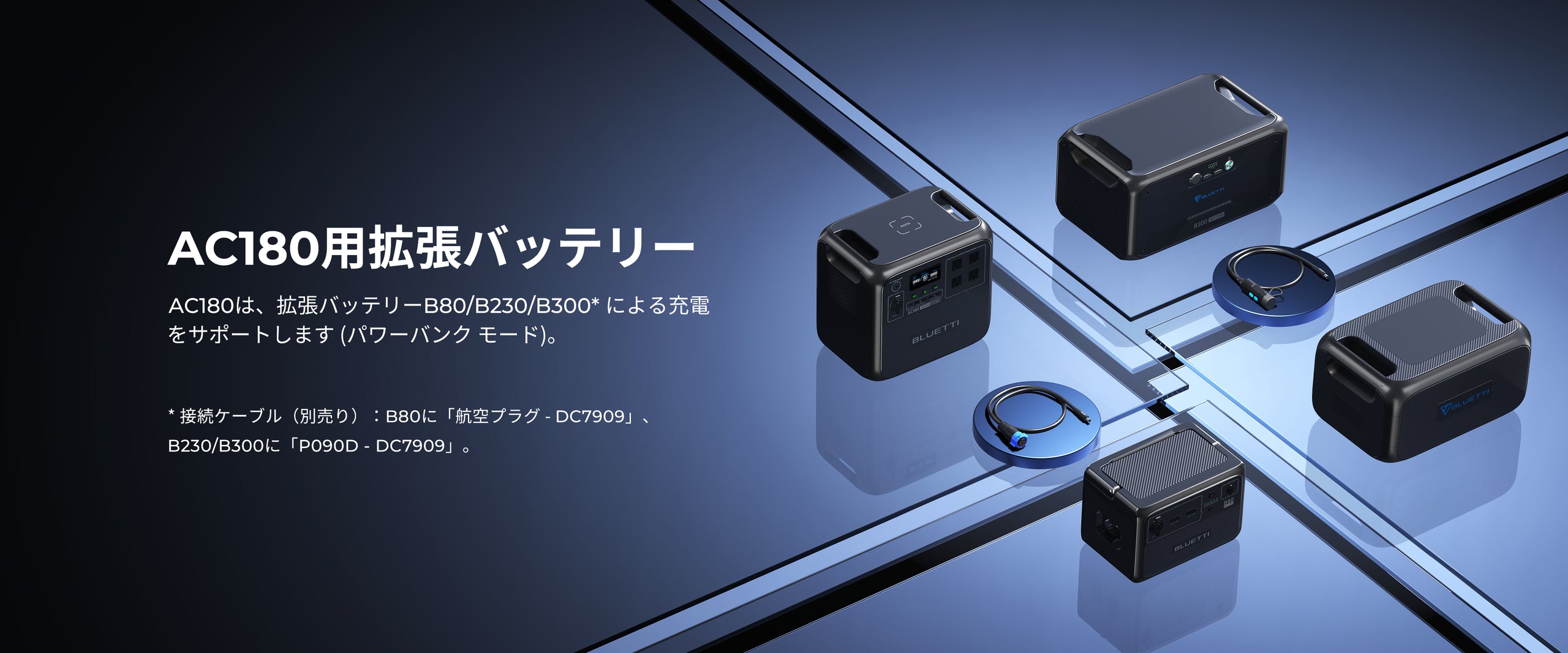 A:AC180P は B80、B230、または B300 バッテリーによる容量拡張をサポートしています。 B80 バッテリーを接続するには、 DC7909 ケーブル*が必要、B230/B300 バッテリーには P090D ケーブルが必要です。