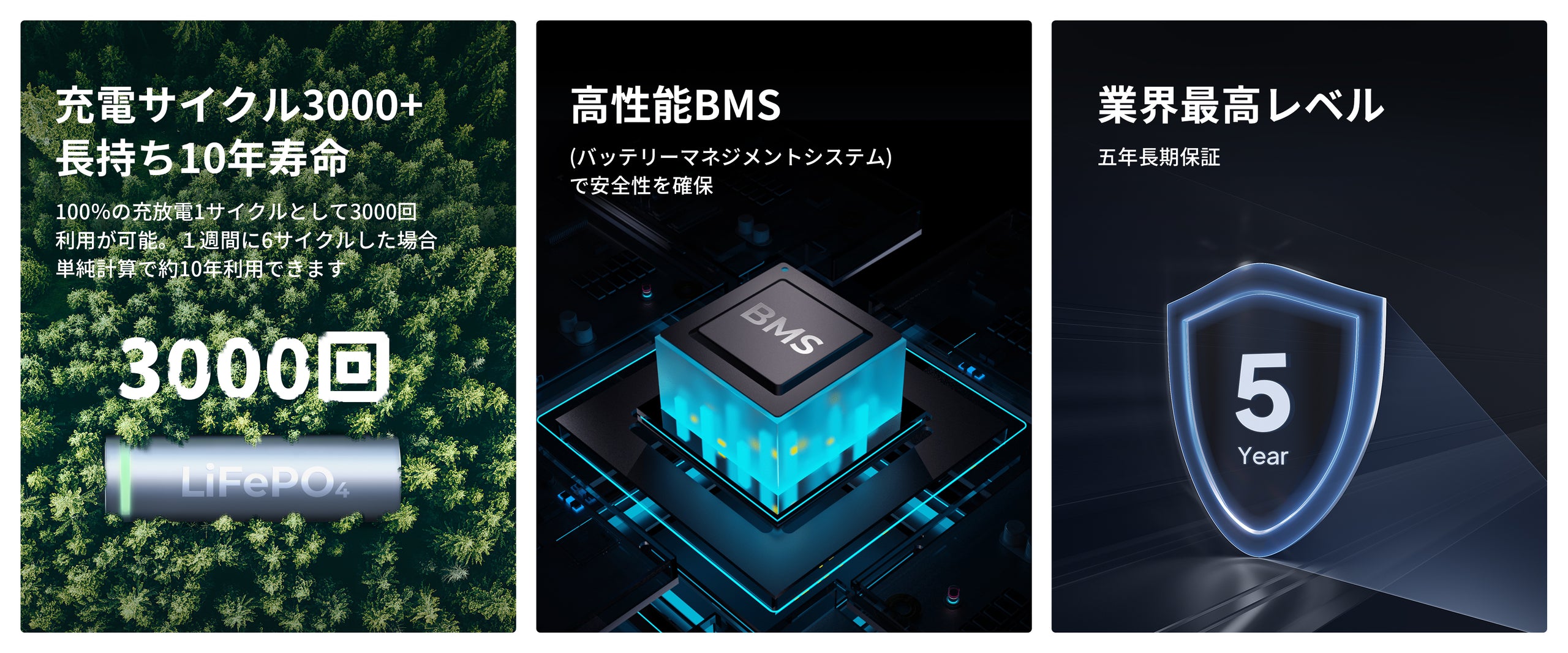 A:内蔵するBMS(バッテリーマネジメントシステム)が、バッテリーの温度と充電状態に応じて充電電力を自動的に調整することで、バッテリーを保護し、長く使えるようにしています。