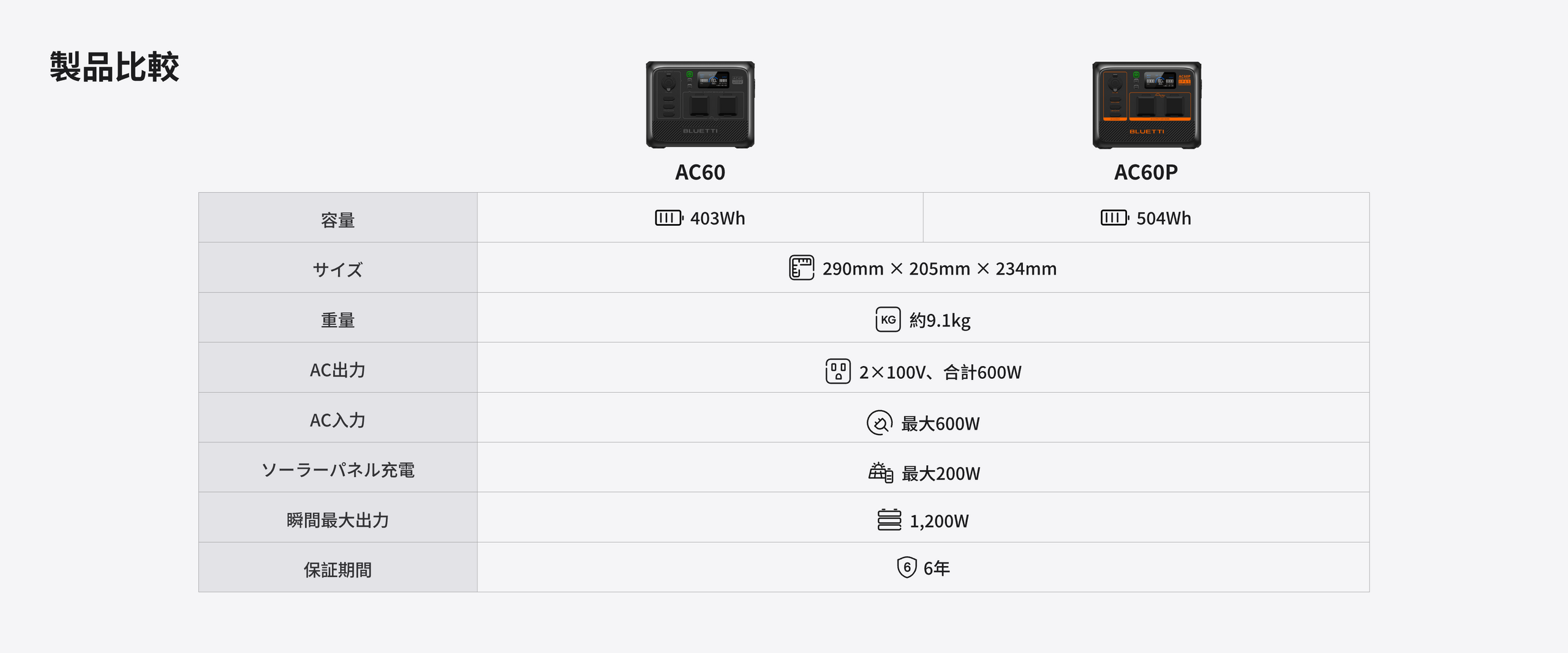 A:お手持ちの機器の定格電力をご確認ください。それが AC60P(600W)の最大出力を超えていなければ、このポータブル電源を使用して動作させることができます。 注:モーター/コンプレッサーを内蔵した一部の機器では、瞬時始動電力が定格電力の 2 ~ 4 倍になる場合があり、AC60Pの上限を超える可能性があります。