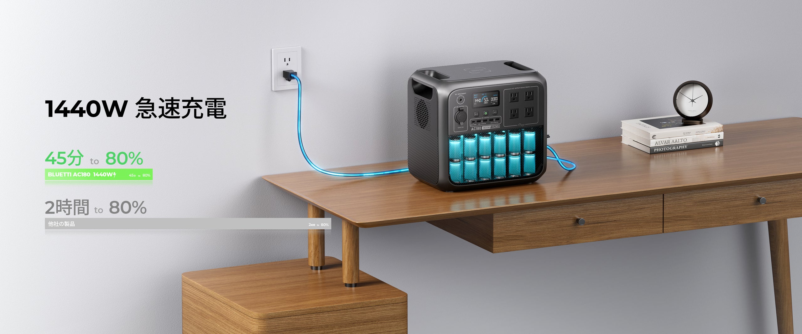 A:AC180 は最大 1,440W の入力に対応します。壁のコンセントにつなぎ、BLUETTI アプリでターボ充電モードを有効にすると、1.3 ~ 1.8 時間でフル充電できます。
