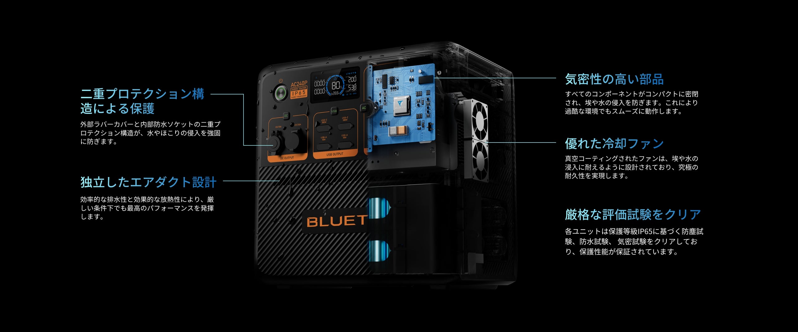 水の浸入による内部コンポーネントの損傷の心配がなく、安全な構造を実現し、通気性も備えています。