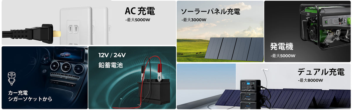 デュアル急速充電に対応しており、AC充電とソーラー充電を併用すると最大8000Wでの入力が可能です。