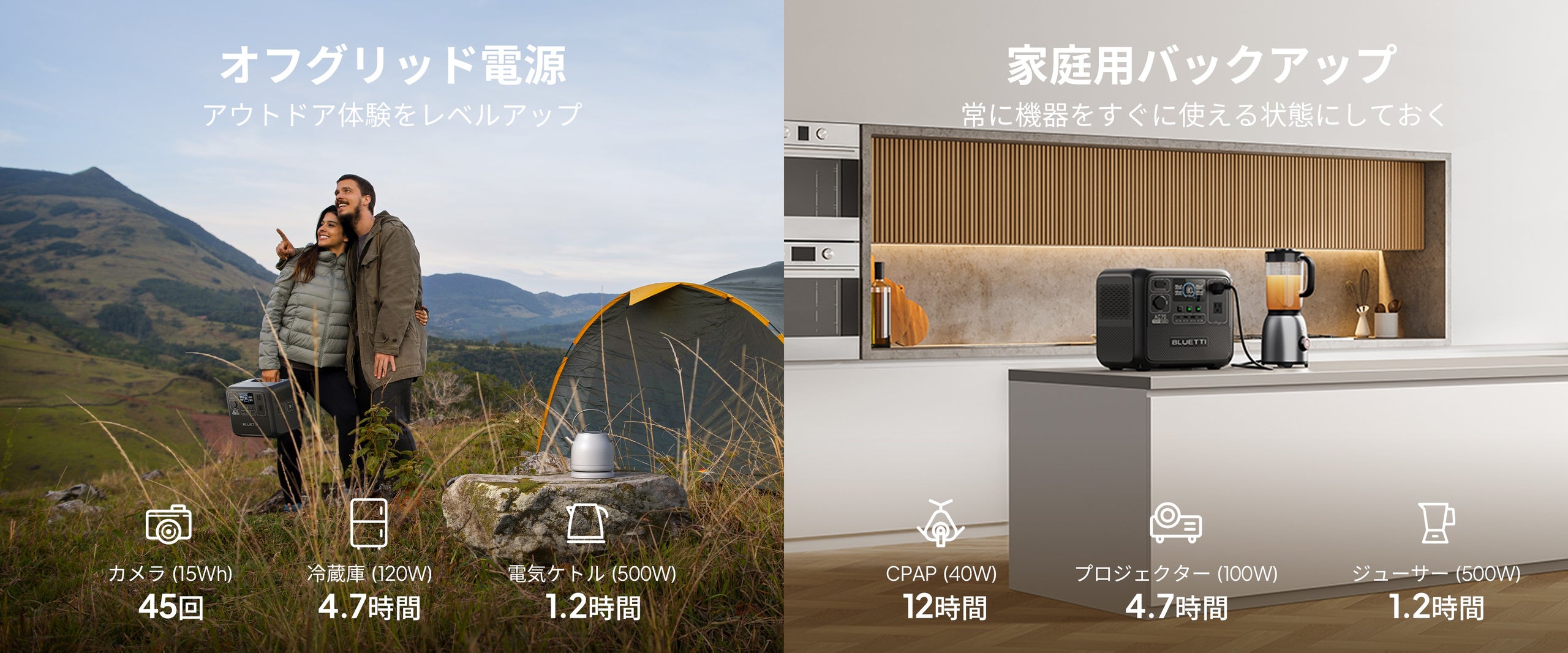 ポータブル電源AC70の定格出力は1000W、電力リフトモードを機能では出力2000Wまでの電熱線搭載の家電(抵抗負荷)が対応可能です。 抵抗負荷:ヘアドライヤーや電気ケトル、ヒーター、こたつ、電気毛布、電器ベスト、トースター、乾燥機(小型)などに適しています。 *エアコンと洗濯機は誘導負荷なので、起動する時定格出力より3~5倍の電力が必要です。起動できない可能性もあります。