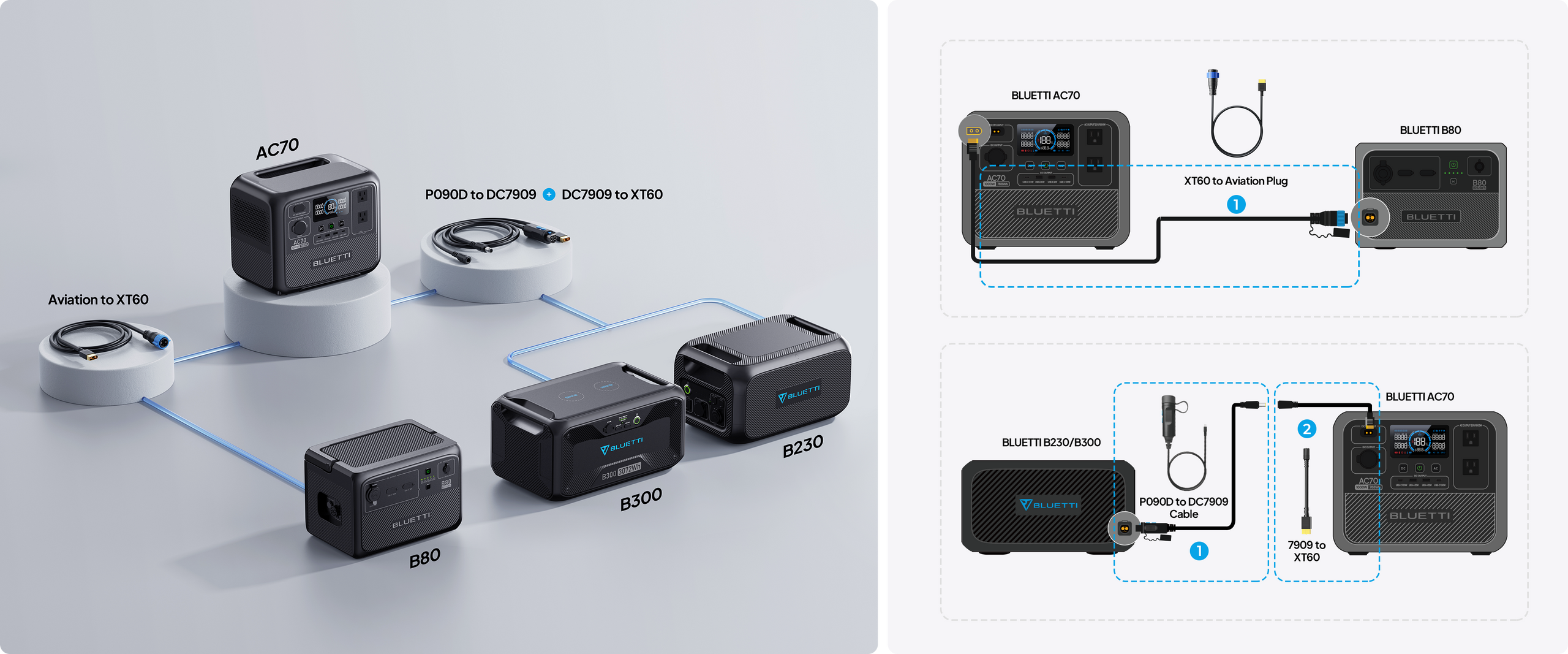 B80は外部バッテリーとしてAC70に給電することができます 接続すればアウトドアや家庭用バックアップ電源にも安心、多くの電力の使用を実現 *別途接続ケーブルが必要です。