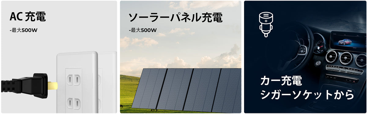 デュアル急速充電に対応しており、AC充電とソーラー充電と車充電を併用すると最大1,000Wでの入力が可能です。1台のB300Sを3.5 ~ 4 時間で充電ができます。