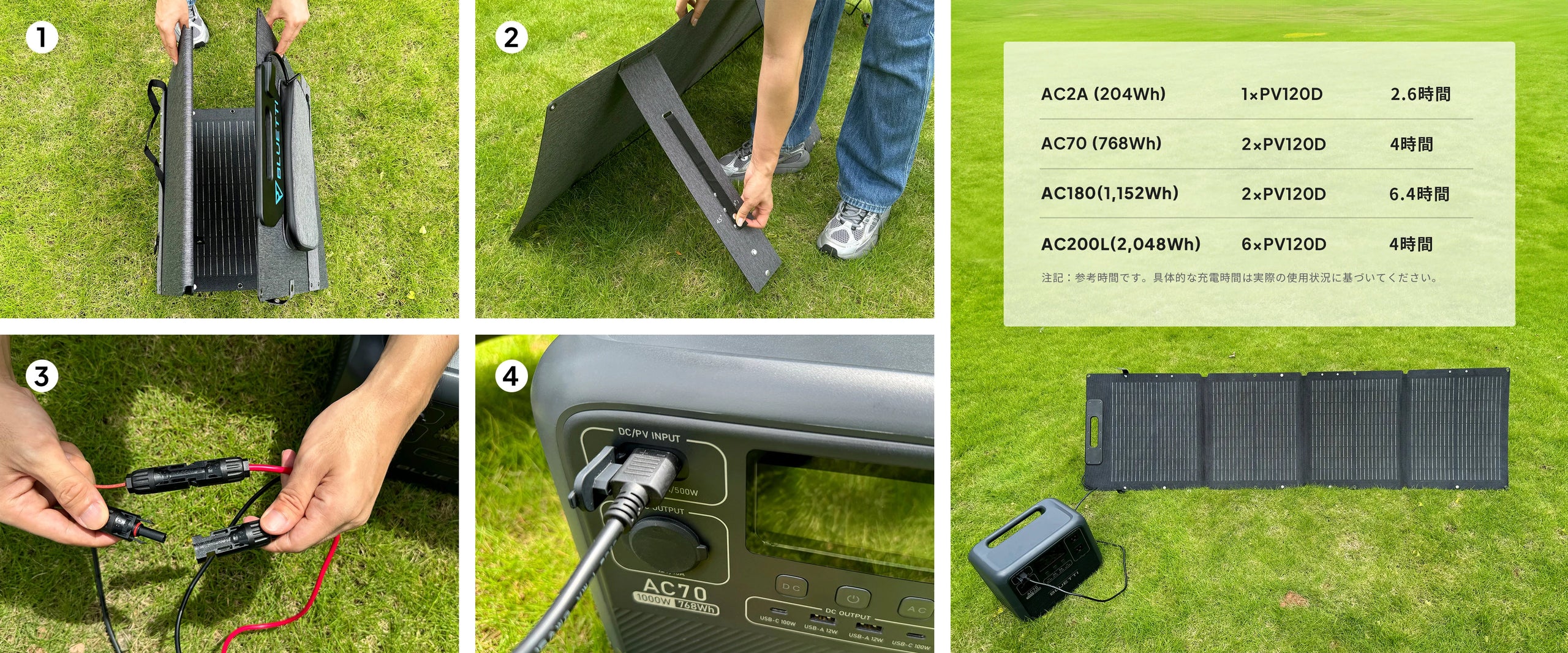 AC70(768Wh)+ 2*PV120D:約4時間で充電