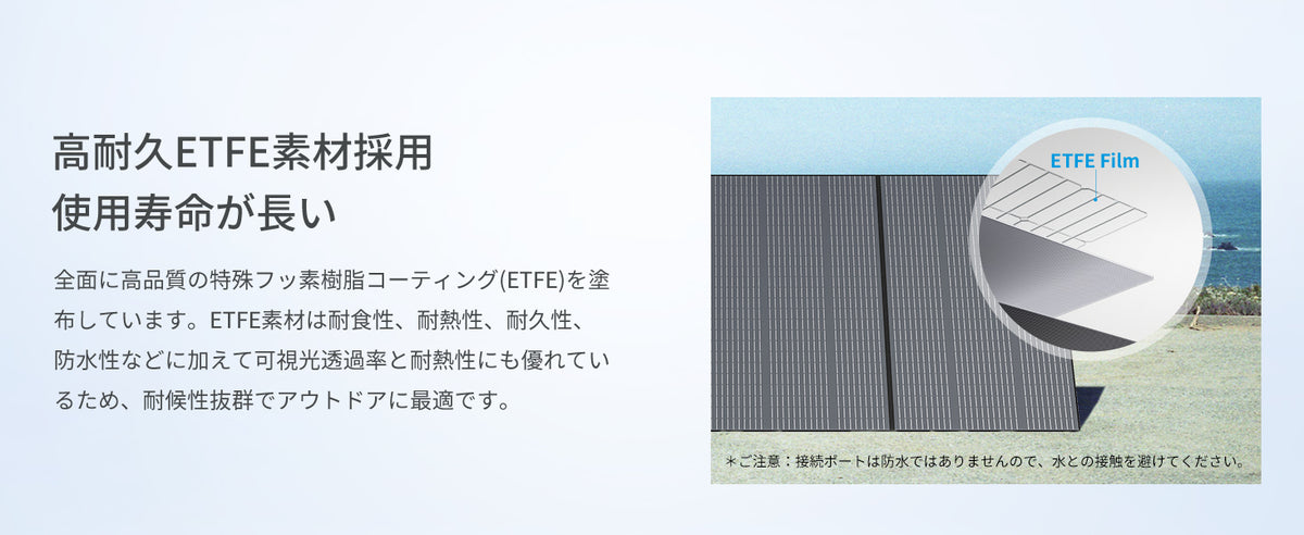 可視光透過率の高いETFE素材を採用しています。ETFE素材は他のフッ素樹脂と比べて塗膜厚が厚く、耐熱・耐食などにも長けており、耐久性が求められる工業用部品などにも用いられています。長く日光に当ても高温を恐れず、燃焼や爆発の危険がありません。防水機能はIP65防水等級となっており、通常の小雨や小雪には問題なく使用できます。豪雨や浸水などには完全防水ではありませんので、耐えられません。ソーラーパネルの寿命長持ちするため、使用時湿気及び濡れないようにご注意ください。