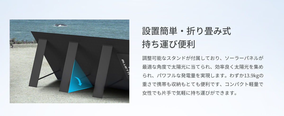 3つの収納型スタンドを搭載しており、展開するとすぐに使える、面倒な設定手間などは不要です。折り畳み時のコンパクト化を実現したので、収納時も場所を取りません。アウトドア、車中泊などのレジャー用途だけではなく、停電時や災害発生時など、急な持ち出しにも負担になりません。