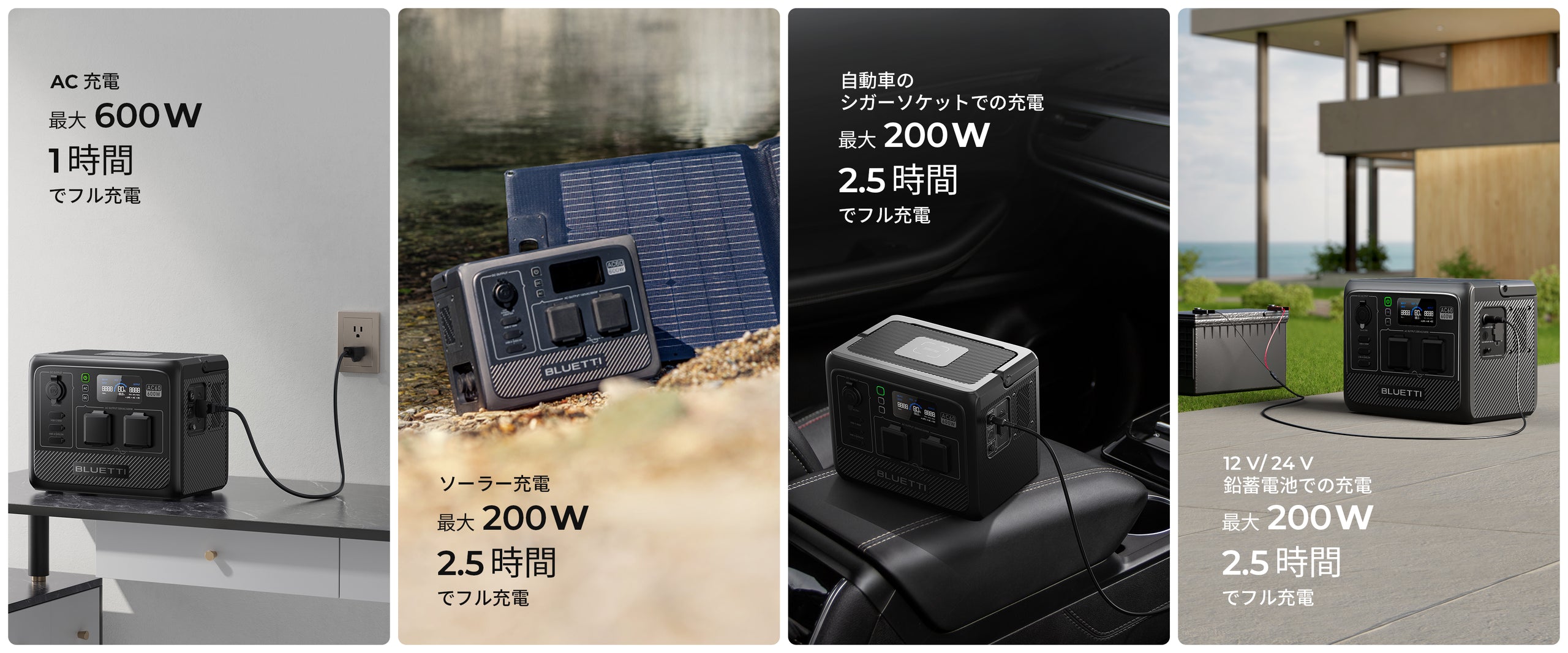 A:AC60 は、最大 600W の入力に対応しています。コンセントにつなぎ、BLUETTI アプリで高速充電モードにすると、1.2 ~ 1.7 時間でフル充電できます。
