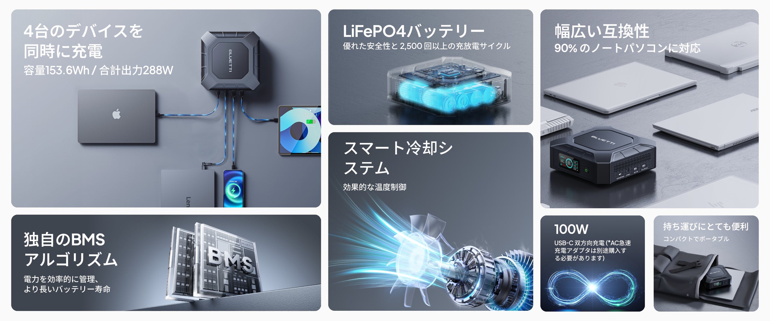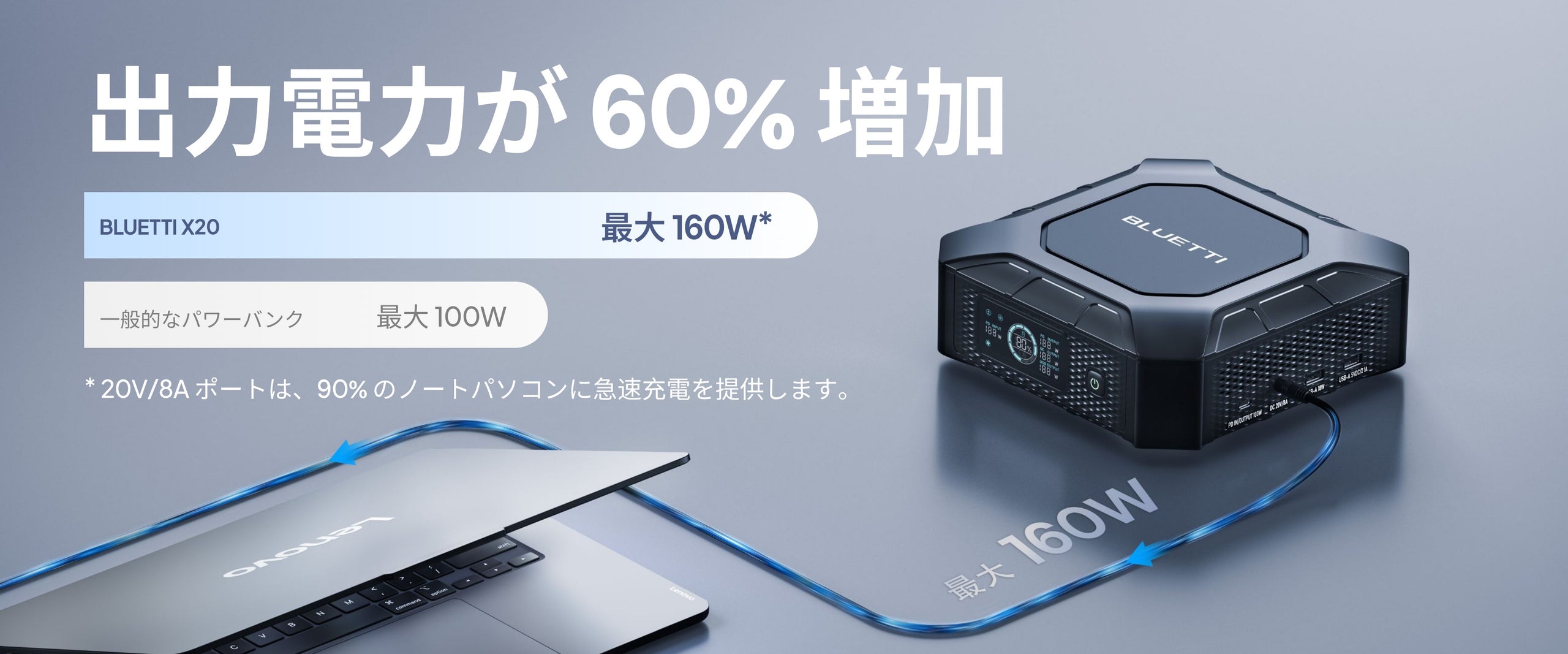 A:X20にはUSB-Cポートと20V/8A出力を備えており、市販のノートパソコンの90%以上と互換性があります。