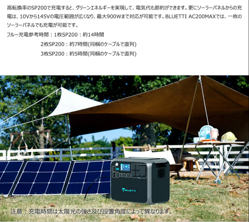 BLUETTI ソーラーパネルSP120(120W)、SP200(200W)より充電する場合、それぞれ1セットから充電可能です。(推奨は2セット以上)